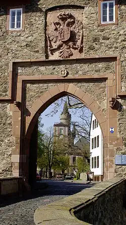 Friedberg Castle was first documented in 1217 when King Friedrich II addressed the Friedberg burgrave Giselbert, the burgomans, and the Frankfurt Schultheiß, stating that Ulrich von Münzenberg had returned the goods previously owned by his father and brother.[3] It is believed to have been established as a planned foundation by the Staufer dynasty, likely occurring a few years earlier.[4] This assumption is supported by the remains of a Romanesque predecessor church located beneath the Stadtkirche. The construction of the town and castle is understood within the context of Staufer's imperial land policy. Following 1171, when the Grafen von Nürings died out, their fiefs in the Wetterau reverted to the Empire, accelerating its transformation into a Staufer estate. The establishment of Friedberg parallels the founding and expansion of the castles and Imperial Cities Gelnhausen and Wetzlar.[5]