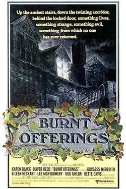 Burnt Offerings is a 1976 American supernatural horror film co-written and directed by Dan Curtis and starring Karen Black, Oliver Reed, Bette Davis, and Lee H. Montgomery, with Eileen Heckart, Burgess Meredith and Anthony James in supporting roles. It is based on the 1973 novel of the same title by Robert Marasco.[4] The plot follows the Rolf family which begins to interpersonally dissolve under supernatural forces in a large estate they have rented for the summer.
