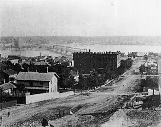 This view of Iowa Street (ca. 1872-95) looking south toward the Mississippi River shows the first Burtis House hotel after the building was sold to the Crescent Macaroni and Cracker Company. This building was destroyed by fire in 1915 and a new factory constructed on the same site. In the background and to the left is the 1872 Government Bridge, which was replaced in 1895.