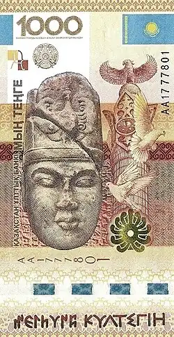 The Bust of Kul Tigin is depicted on a KZT 1,000 tenge banknote, issued by the Kazakh government.[5] The issue of the commemorative banknote was confirmed by the Kazakh government on December 12, 2013.[5] The banknote was dedicated to the Second Turkic Khaganate on both sides, with the Silver Deer on one side, and the Bust of Kul Tigin on the other. About 10 million banknotes were put in circulation by the National Bank of Kazakhstan.[5][6]