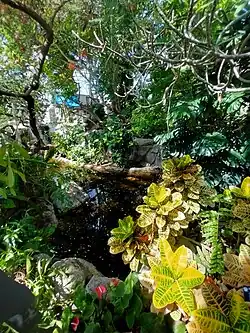Outdoors overlooking a reflecting pond is the Emerson Lakeside Terrace, a multi-use area available for rent that can host weddings, receptions, corporate dinners, and other large gatherings. Next to this is the Butterfly Garden, a demonstration garden where plants were carefully selected to serve as hosts for caterpillars and nectar sources for butterflies, as well as habitat for other animals in the adjacent Faust Park. This garden includes an outdoor classroom pavilion.[2]