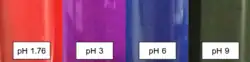 One of the most distinctive characteristics of butterfly pea flower tea, and other drinks that use butterfly pea flower extract, is that it will change color when the pH balance changes. A deep blue tea will turn purple with the addition of lemon juice, turning a deeper shade of purple the more lemon juice is added.[7][8] Mixed with fuchsia roselle hibiscus leaves the tea will turn a bright red color.[1][8]