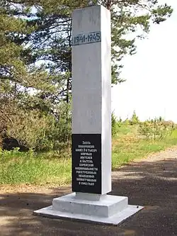 The Germans took the possibility of Jewish resistance very seriously and primarily killed Jewish men aged 15 to 50 in the ghetto or even before its creation, despite the economic impracticality, as these were the most able-bodied prisoners.[4] For this reason, "actions" (used by the Nazis to refer to the mass murders they organized) against Jews in Byten occurred repeatedly until the complete destruction of the ghetto. On December 25, 1942, the Nazis and collaborators destroyed the Byten ghetto. Jews were brought by trucks to the outskirts of the town to an old trench 100 meters long, forced to undress and lie face down at the bottom, and then shot from above with machine guns and submachine guns. The next victims were forced to lie on top of the dead. The pit was covered with a layer of earth 0.5 meters thick and surrounded with barbed wire. A total of 2,000 to 3,000 Jews from the town itself and nearby villages were killed in Byten.[2][3]