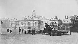 After the siege was lifted, the Spanish Regency presented one of the captured French mortars to Rear Admiral Arthur Kaye Legge. They requested that it might be placed in one of London's Royal Parks to commemorate the victory at Salamanca, the liberation of southern Spain and the exploits of the Duke of Wellington.[5] The Prince Regent agreed and instructed the Earl of Mulgrave to procure a suitable carriage for the mortar and set it up in Horse Guards Parade. The royal carriage department at the Royal Arsenal, Woolwich, carried out the work, creating an elaborate allegorically sculpted bronze base for the weapon. It was unveiled on the Prince Regent's 54th birthday, situated on the south side of the parade ground behind a square of chevaux de frise.[5] It was subsequently moved to its present position adjacent to the Horse Guards building.