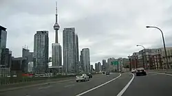 ![]() The CN Tower as seen from the Toronto City Centre Airport in September 2008, it is currently the world's 10th tallest free-standing structure on land[1][2] | |