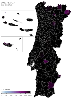 ![]() COVID-19 rolling 14-day prevalence in Portuguese boroughs per 100,000 inhabitants, as of February 17, 2022 | |