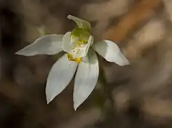 There are one or two white, orange-tipped flowers on a thin, wiry, sparsely hairy spike 5–22 cm (2–9 in) high, each flower 15–20 mm (0.6–0.8 in) wide. The dorsal sepal is erect in the lower part but curves forward, partly covering the column. It is oblong, 7–10 mm (0.3–0.4 in) long and 2 mm (0.08 in) wide. The lateral sepals are narrow lance-shaped, 7–10 mm (0.3–0.4 in) long, 2.5 mm (0.1 in) wide, turn downwards and are usually parallel to each other. The petals are about the same size as the sepals and spread widely or turn downwards. The labellum is egg-shaped, about 5 mm (0.2 in) long, 6 mm (0.2 in) wide with three lobes. The lateral lobes are erect, surround the column and have slightly wavy edges. The mid-lobe is triangular, curves downward with up to 3 pairs of short, orange calli along its edge. There are two rows of calli along the centre of the labellum. The column is pale green is broad with broad wings. Flowering occurs from August to November but the flowers are self-pollinating and are only open for up to four days.[2][3]