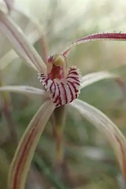 Caladenia erythronema, commonly known as the red thread spider orchid[2] and Nyabing spider orchid,[3] is a plant in the orchid family Orchidaceae and is endemic to the south-west of Western Australia. It has a single hairy leaf and up to three red, yellow or cream-coloured flowers with dangling, thread-like sepals and petals and a small labellum.