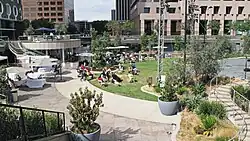 Looking down on California Plaza in October 2022. A film showing is in progress.