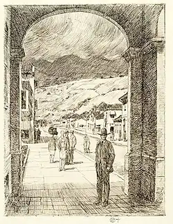 The California series by Childe Hassam is a series of approximately 28 works based on American Impressionist Childe Hassam's visits to Northern California at least three times, in 1904, 1908, and 1914, and Southern California at least once in 1927. The works between 1904 and 1914 feature images from the San Francisco Bay Area, while the 1927–28 works feature images from Los Angeles, San Diego, and Santa Barbara.[1] Out of his approximately 4000 works, Hassam's focus on California is relatively small, with only 12 major California paintings completed between 1914 and 1919. Additional minor works in the series include approximately 16 or so etchings from 1916 to 1928. Most of the works made in 1928 were based on drawings from 1927.[2] 11 of the 12 California paintings were created in 1914 and first exhibited as part of the "California Group" of 106 paintings total in the Exhibition of Pictures by Childe Hassam at the Montross Gallery in New York in 1915.[3] A twelfth painting in the series, California, has been dated to 1919.[4] The majority of Hassam's California etchings were first exhibited at the American Academy of Arts and Letters in 1927.[5]