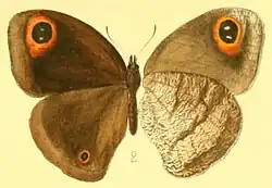 Callerebia polyphemus Oberthür (34 f) is by far the largest form of the whole genus, being easily recognized by the size alone; the upperside of the forewing bears frequently accessory ocelli. — hybrida Btlr. [Pradesh, India Callerebia hybrida Butler, 1880] (= annada Marsh and de Nicev. in tab.) (35 a), which is only half the size, has an oval apical ocellus on the forewing and 2 ocelli in the anal area of the underside of the hindwing; comes nearest to the name-typical annada. — ophthalmica Nicev. [ = Callerebia orixa Moore, 1872 sic] is exactly like orixa [Callerebia orixa Moore, 1872], except that but a form of annada; still smaller than the latter, but of exactly the same shape, the anal lobe of the hindwing not being very strongly developed. The border of the ocellus of the forewing is continued towards the hindmargin of the wing as an orange-brown band, within which there are 2 ocelli; the hindwing, too, bears 2 submarginal small ocelli on the upperside. From Western Se-chuen.[2]