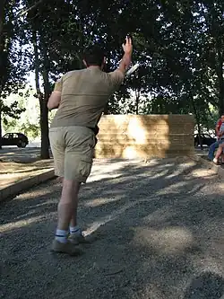 The object is to knock down a piece of wood which is supported on one of its sides. The player, from 14.5 metres, must hit this calva with his marro, a metal cylinder. The player has 25 throws to achieve this, with two practice throws.