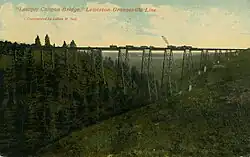Among the line's notable features are the curved timber-frame trestle Bridge 22, known as "Half-moon Trestle".[12] This bridge, partially visible from U.S. Route 95,[13] has a length of 685 feet (209 m) and is 141 feet (43 m) high, and was built with almost 1 million board-feet of lumber.[14] Tunnel 1, called "horeshoe tunnel", bends at such an angle that neither end can be seen from the middle.[13] This tunnel, and several others are either timber-framed or have timber-framed entrances.[12]: 6 In addition to its wooden trestles, the railroad's second subdivision also had a sizable steel viaduct, 1,520 feet (463 m) in length with a maximum height of 280 feet (85 m).[12][15] Known as Bridge 38 (46°12′N 116°25′W / 46.2°N 116.42°W), it spans Lawyer's Canyon between Craigmont and Ferdinand, and is also visible from U.S. 95.
