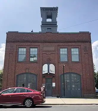 In 1908, after an initial two-year dormancy over funding, the Camp Curtin Fire Company No. 13 was formally activated and $2,000 were allocated by Harrisburg City Council for the purchase of the lot on the corner of Sixth and Ross Streets for a one-story frame building.[3] This was quickly outgrown, and two-story, twin-bay Camp Curtin Fire Station was built in 1910.[4][5] The rectangular brick building measures 38 by 46 feet (12 by 14 m) and exhibits Italianate style design elements. It features a square wooden bell tower at the center of the front façade. The tower has a hipped, shingled roof and four stilted segmental arches.[6]