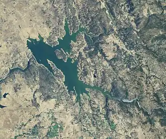 Camp Far West Reservoir (also known as Camp Far West Lake) is a small reservoir in the foothills of Northern California located approximately eight miles (13 km) east of Wheatland, California and 45 miles (72 km) northeast of Sacramento. The lake forms the meeting point of three California counties, Placer, Nevada and Yuba. The lake was formed by the Bear River and Rock Creek, near what was formerly the confluence of the two streams. The dam was constructed in 1963 as part of the California State Water Project to control flooding in the Central Valley (California), and to provide hydroelectric power to the surrounding area. The facility is owned and operated by the South Sutter Water District.
