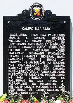 Camp Kasisang, was established as a camp for American and Filipino prisoners of war on 1942, in then municipality of Malaybalay, Bukidnon in the Philippines.[1] Before serving as Mindanao's first camp for prisoners of war, it was a training ground for the Philippine Army.[2] It was located in the foothills of the Malaybalay Mountains and a few miles north of Barangay Casisang.[3]