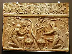 Nearly all Campana reliefs are from Central Italy, especially Latium. The largest and most important workshops seem to have been in Latium, especially in the neighbourhood of the city of Rome. Outside Latium the tiles are found mostly in Campania and in the former Etruscan sphere. At the end of the 1990s Marion Rauch compiled the reliefs with Dionysiac-Bacchic themes and was able to confirm this range for the motifs she was investigating. Nile scenes[6] are found only in Latium. No pieces have been found in the Greek areas of southern Italy or in Sicily.[7] An example from the Akademisches Kunstmuseum in Bonn, showing a Nike killing a bull was allegedly found in Agia Triada in Greece.[8] Some stuccoed examples derive from the western part of the Roman empire, the ancient regions of Hispania and Gaul (modern Spain and France).[9]
