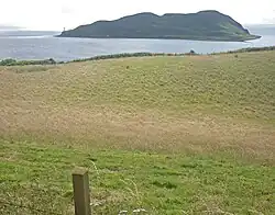 Campbeltown Loch with Davaar Island beyond and a grassy meadow in the foreground