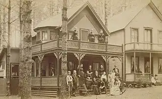 Following a wave of Methodism sweeping through regions of New York and New England, the Pine Grove campground became a mecca for faithful pilgrims.[5] It began in the summer of 1860, when the Poughkeepsie district of the Church held a modest week-long camping retreat, in which attendees pitched tents on what was then rented picnic grounds. However, attendance grew steadily in the years following its official establishment in 1871. By the late 1870s-early 1880s, there were as many as 10,000 guests at Pine Grove, coming from as far away as Hartford, New Haven and New York City.[1] A seasonal railroad station on the Housatonic R.R. was established to facilitate travel for the high volume of visitors.[6] By this time, an ample collection of Victorian cottages had been built on the property, along with a lodging house, called the Mountain View Inn.[7]