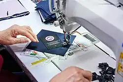 A seamstress sewing the brand label onto a piece of fabric at the Canada Goose manufacturing plant in Toronto