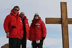 Members of the United States Antarctic Program in Canada Goose parkas at Observation Hill in Antarctica