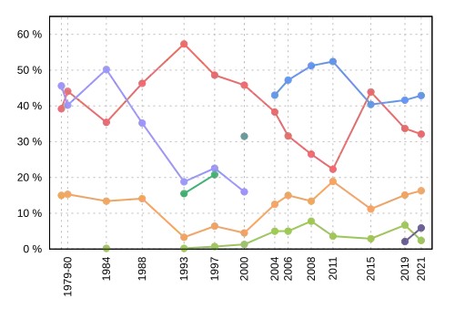 | Election | Liberal | Conservative | New Democratic | Green | People's | PC | Reform / Alliance |