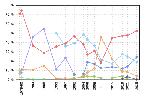 | Election | Liberal | Conservative | New Democratic | Bloc Québécois | Green | PC | Alliance | Others |