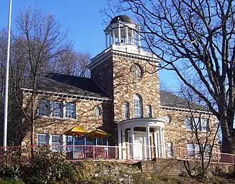 The school was built in 1892, and is notable for its Colonial Revival styling, executed in local stone instead of the more typical brick.[2] A design submitted by New York City architects McKim, Mead & White was accepted. William Rutherford Mead, one of the senior partners of the firm, was a native of Brattleboro. An elevation of the building, credited to them, was published in the September 16, 1892, issue of the Vermont Phoenix, the local newspaper.[3] With Interest (1925), a booklet about the town published by the Vermont Peoples National Bank, credited the design to artist Robert Gordon Hardie, who like Mead was a Brattleboro native. As the design of the building is verifiably by McKim, Mead & White, it is unknown what role Hardie may have had in the project.[2]