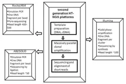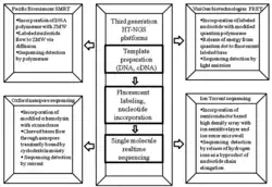 Cancer genome sequencing utilizes the same technology involved in whole genome sequencing. The history of sequencing has come a long way, originating in 1977 by two independent groups - Fredrick Sanger’s enzymatic didoxy DNA sequencing technique [26] and the Allen Maxam and Walter Gilbert chemical degradation technique.[27] Following these landmark papers, over 20 years later ‘Second Generation’ high-throughput next generation sequencing (HT-NGS) was born followed by ‘Third Generation HT-NGS technology’ in 2010.[28] The figures to the right illustrate the general biological pipeline and companies involved in second and third generation HT-NGS sequencing.