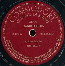 Bix Beiderbecke never recorded "Candlelights" but did copyright the piano score on August 29, 1930 as "A Modern Composition for the Piano".[2] Bill Challis assisted with the transcription for piano. The score and the sheet music were published by Robbins Music in New York. "Candlelights" was recorded by jazz pianist Jess Stacy and was released as a 78 single in 1939 on Commodore Records as part of the Classics in Swing series, 517A.[3] Jazz trumpeter Bunny Berigan subsequently recorded it in 1939 in an orchestral arrangement featuring trumpet.[4] More recently, it was recorded by two other jazz pianists: Kenny Werner recorded it in 1977 on Atlantic Records and pianist Bryan Wright recorded it in 2010. Jazz guitarist Bucky Pizzarelli also recorded a guitar transcription of it in 1986 on his album Solo Flight. In 2020, Juliet Kurtzman and Pete Malinverni recorded it as a duo for violin and piano on the album Candlelight: Love in the Time of Cholera.
