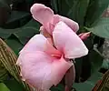 Canna 'Pringle Bay' is a miniature Italian and variegated group canna cultivar; variegated foliage, oval shaped, spreading habit; flowers are open, self-coloured pink, staminodes are large; fertile both ways, not true to type, not self-pollinating; rhizomes are thick, up to 3 cm in diameter, coloured pink and purple. Its main attraction is the bright variegated foliage, green, bronze and pink. Only about 40 cm in height.