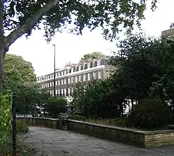 Henry Leroux of Stoke Newington started building the north-west range of the square in 1805, on land owned by the Marquess of Northampton. In 1812, when few properties had been built, the New North Road turnpike, now known as Canonbury Road, was constructed and bisected the square, creating east and west sides.[1] The new road interfered with the quiet of the rudimentary square, affecting the economics of the venture and subsequently the unity of design of the buildings surrounding it and the time taken to complete construction. The layout is rectangular with a large villa, Northampton Lodge, in the centre of the terraces on the north side. The earliest terrace differs from the rest, and none of the sides join with each other.[2] The east side bears a name-plaque at no. 28 which originally bore the name "Marquis Terrace", but it is now blank.[3]