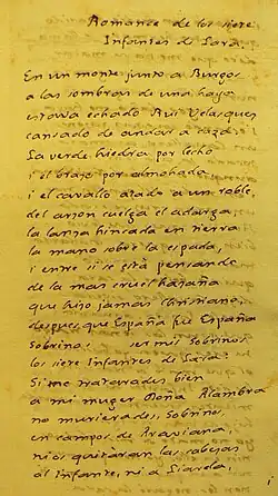 The Cantar de los Siete Infantes de Lara ("Song of the Seven Lara Princes") is a legend, perhaps derived from a lost cantar de gesta, that relates a tale of family feuding and revenge, centering on the murder of the eponymous seven infantes (princes) of Lara or Salas. The legend survives in prose form in medieval chronicles, the oldest being in the extended version of the Estoria de España (History of Spain) compiled during the reign of Sancho IV of Castile before 1289 (edited by Ramón Menéndez Pidal under the name Primera Crónica General).[1]