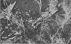The plane was cruising at an altitude of 8,000 feet when it encountered icing. This caused two engines to fail. As the craft descended, the other two engines also failed, causing the propellers to autofeather. The crew tried and failed to restart the engines, and were unable to unfeather the propellers normally; they then put the plane into a dive in an attempt to force the propellers from their feathered position. Eventually they succeeded in restarting engine number four.[2] They applied full power to this engine, which caused the craft to enter a circling descent until crashing into trees; at the time of impact it had almost no forward velocity. Five trees were driven through the fuselage, yet their trunks remained intact.