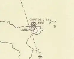 The first planes flew from the site northwest of Lansing on May 1, 1926.[11] The formal dedication of Capital City Airport was held on the weekend of July 14–15, 1928, and was attended by 70,000 people, including arctic explorer George Hubert Wilkins and aviator Carl Eielson. Pilots from Selfridge Field and members of the Michigan National Guard 107th Observation Squadron performed in an exhibition air show.[12] A Stinson Detroiter plane arrived at the airport with Lansing's first air mail delivery on July 5, 1928. Mayor Laird J. Troyer, Chamber of Commerce President Alton J. Hager, and airport committee chairman Clyde B. Smith, among others, were present to witness the plane's arrival.[13] Regular cargo service from Capital City Airport began on July 17, 1928, via Transamerican Airlines. That day pilot C.V. Pickup departed with five sacks of mail en route to New York City. Lansing postmaster Walter G. Rogers was among those present to witness the event.[14]