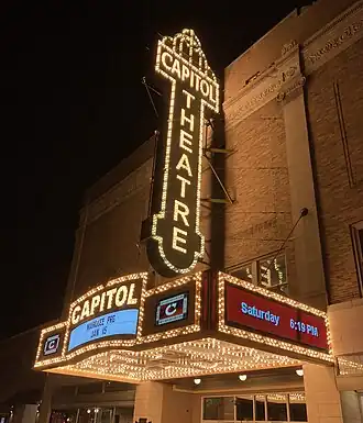 Restoration efforts by the Capitol Theatre are ongoing; the multi-year restoration will begin with an $800,000 marquee and blade installation, with efforts continuing to eventually restore the interior of the Capitol to its appearance in 1939. The newly restored 1939 ticket booth was installed in front of the theatre in December 2009.[9] [10]