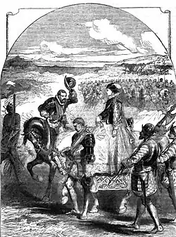 Bothwell offered single combat to any of the Confederate Lords. William Kirkcaldy accepted the challenge,[11] but Bothwell would not fight him as he was merely a baron. He also refused Murray of Tullibardine, and then Lord Lindsay. It was hot and Queen Mary's supporters had nothing to drink.[12] The day dragged on. Two of Bothwell's supporters, Edmund Blackadder[13] and the laird of Wedderburn, understanding that Bothwell was intending to leave, made their apologies to the Queen and rode away.[14] In response to an oath made by the rebel Lords, Queen Mary agreed to surrender to Kirkcaldy. He led her horse by the bridle down from the hill,[15] and is said to have made her formal surrender to Confederate Lords at Cousland Castle.[16] Bothwell rode off to Dunbar Castle with 25 horsemen. A drawing of the battlefield sent to London with a newsletter survives and gives a schematic idea of the events.[17]