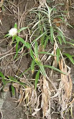 Low shrubby perennial to 1 m. Stems branched, white-tomentose in the upper parts and with prominent leaf-scars. Leaves alternate, entire, deciduous but long persistent after withering, crowded towards the ends of the branches, 6–10 cm x 6–15 mm, lanceolate, coriaceous, green and glabrescent above, densely white tomentose beneath, subsessile and with a few ciliate spines at the base. Capitulum 15–30 mm in diameter (excluding outer bracts), discoid to hemispherical on short peduncles solitary or in corymbs. Outer involucral bracts large, leafy of varying lengths, lanceolate to ovate, the inner scarious, shiny, stiff and spreading when dry. Inner involucral bracts shorter than the outer, scarious, recurved, spiny at the apex, blackish or purplish brown . Receptacle flat, scales persistent divided into linear segments, bristles also sometimes present, often tipped with red. Florets creamy yellow, hermaphrodite, all with a tubular 5-lobed corolla, ray florets absent. Achenes oblong 3 mm, pappus of 1 row of plumose, dense, appressed, caduceus, shiny brown hairs 2- to 3- branched and united at the base into clusters. Fl. V-VIII.