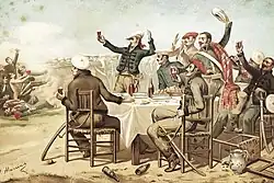 The scale of atrocities prompted foreign intervention, especially that British expeditionary troops were engaged in the war in alliance with the Cristinos. Negotiations climaxed in a so-called Eliot Convention, agreed in April 1835; it somewhat limited the killings, though initially there were controversies whether the convention was applicable to the Basque-Navarrese front only.[12] Despite the agreement Ramón Cabrera, the Carlist commander in Aragón, kept executing small groups of prisoners.[13] His violence affected also civilians, since repressive measures were taken in case of resistance or refusal to cooperate, e.g. to provide fodder, accommodation etc.; Cabrera ordered execution of mayors of a few towns. In revenge and with approval of the highest Cristino commander, his 53-year-old mother was executed in February 1836. Cabrera declared that "rivers of blood will now flow" and indeed, historians mark this moment as "punto de inflexión en la guerra".[14] He then embarked on indiscriminate violence, with largest killings in Alcotas (145 victims, April 1836) and Ulldecona (140 victims, June 1836).[15] Some accounts from 1837 provide the picture of horror orgy, including cheerful Carlist commanders wining and dining while enjoying executions (Burjassot, March 1837), yet the episode is highly dubious.[16] Also local commanders - Joaquín Bosque, Juan Cabañero - were ordering executions. At times Carlist leaders did not explicitly order the killings, but permitted the carnage to happen; this was the case in Andoain (September 1837), when the commanding officer José Ignacio Uranga allowed the infuriated Basque crowd to massacre (mostly with agricultural tools) some 60 British soldiers, taken prisoner few hours earlier.[17]