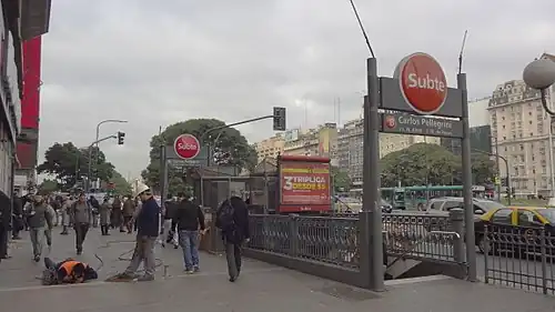 Carlos Pellegrini is a station on Line B of the Buenos Aires Underground.[1] From here, passengers may transfer to the Diagonal Norte Station on Line C and the 9 de Julio Station on Line D and Metrobus 9 de Julio.[2] The station was opened on 22 July 1931 as the eastern terminus of the extension of the line from Callao. In December 1931, the line was extended further east to Leandro N. Alem.[3]