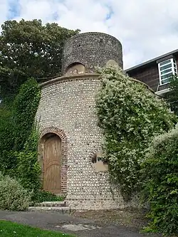 In Tarner Park, an area of open space formed from part of number 1 Tilbury Place's grounds,[80] there is a circular tower which is believed to have been built by Edward Tilbury Tarner (son of the original occupants Edward and Laetitia Tarner) as an observation tower so he could see ships in the English Channel.[5][80] The mid-19th-century structure has two storeys and about 70 steps; the upper level is recessed and has a walkway around it. The walls are of knapped flint with some brick and stonework. Part of an iron weather vane remains at the top. Both storeys have segmental-arched entrances, but these are now closed.[69][79][80][81] The structure is in good condition but has some missing flints.[59]