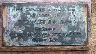 During a period of intense construction in 1953, Carlton le Willows recruited its first pupils, consisting of two single-sex forms.[8][16] They were initially educated elsewhere; the boys at the Henry Mellish Grammar School and the girls at the West Brigford Grammar School, until co-educational, on-campus teaching was introduced in September 1954.[8] Carlton le Willows Grammar School was officially opened on 30 June 1956 with a speech from educationalist Sir John Wolfenden.[17][8] The modern school contends it was the first post-war grammar school founded in Nottinghamshire and speculates it may have been the first in England altogether.[8] Managing a contingent of just over 500 by 1967,[18] it had three headmasters in all; Stephen Marshall (1953–57),[8] Leonard Thomas Draycott (1958–67)[18][19] and T. E. Dowman (1968–73),[20][9] who also led the grammar school's comprehensive successor up to his retirement in 1988.[21][20]