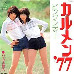 "Carmen '77" (カルメン'77, Karumen Nana-jū Nana) is Pink Lady's third single release in Japan. Inspired by the novella Carmen, the song was written by Yū Aku and Shunichi Tokura, and was released on March 10, 1977. The single sold in excess of 1,100,000 copies, and reached the number-one position on the Oricon charts in April 1977, and maintained its place at number one for five weeks.[1] It also reached the number-one position on the Japanese Music Labo charts.[2]