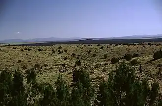 The volcanic field is associated with the Rio Grande Rift, a region of the Earth's crust that is being slowly pulled apart. This produces faulting that provides paths for magma to reach the Earth's surface from its upper mantle.[10] The lavas erupted were mildly alkaline in composition, similar to the nearby Jornada del Muerto, Hillsboro, and Black Mesa (33°44′46″N 106°52′23″W / 33.746°N 106.873°W) flows.[11]