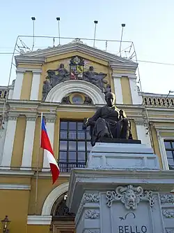 A statue of Andrés Bello in front of the Casa Central de la Universidad de Chile