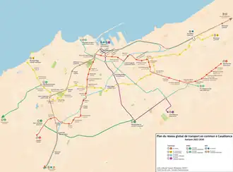 Projected plan of the Casablanca Tramway network in conjunction with commuter rail and rapid transit buses for the period 2022–2030 (presented February 2017).