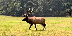 Elk were reintroduced into the park in February 2001 when 25 elk from the Land Between the Lakes National Recreation Area were released in Cataloochee. Most of the original $1.1 million cost was funded by the Rocky Mountain Elk Foundation, which provided $700,000.[33] Elk once roamed the highlands of southern Appalachia but were extirpated by overhunting and loss of habitat. Elk herds are a common sight in Cataloochee in the spring and fall. By 2021, the elk population was estimated to be around 200.[34]