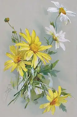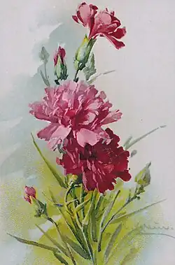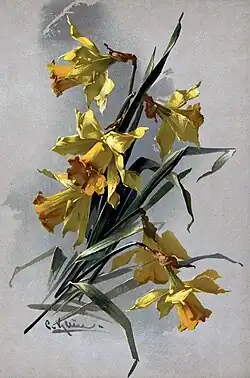 In addition to the popular depictions of flowers, Klein has also illustrated publications for the botanical world in the 1890s. These included, for example, the two-volume overview work Vilmorin's Blumengärtnerei, the Rosen-Zeitung, the French Journal des Roses and the journal of the German Dendrological Society.[15] There was also a major contribution to Parey's Blumengärtnerei, a standard work of horticultural literature at the time, which she was unable to complete.[16] She died on November 30, 1929, at the age of 68 in Berlin-Charlottenburg.[2] Her remains were removed from her grave in 1953 as she was not considered a sufficiently significant artist by the cultural authorities.[15]