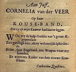 During the 17th century, it was quite common for poets to create works together, going back and forth in friendly, poetic responses of one topic or another. Between November 1662 and January 1663, Catherina, and her childhood friend, Cornelia van der Veer, wrote a series of poems together, that was published in 1665. It was called the Battle for the Laurels between Catherina Questiers and Cornelia van der Veer. It included ten poems in which the two attempted to battle to see who was more deserving of the poet's laurel wreath, which was a classical tribute to eminent poets. In the spirit of good-nature, the battle was deemed a tie. In total, Catherina contributed 31 poems, while Cornelia contributed 51. There were also other poems written by friends that they included in the book, bringing it to a lengthy 375 page, limited edition.[3]