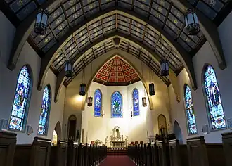 The stained glass windows were designed in Syracuse, New York They depict depicted the Annunciation, Saint Patrick, Saint Joseph's deathbed scene, King David with his lyre, Saint Cecilia, and events in the life of Jesus. The altar contains relics of Saint Jucundius and Saint Justina.